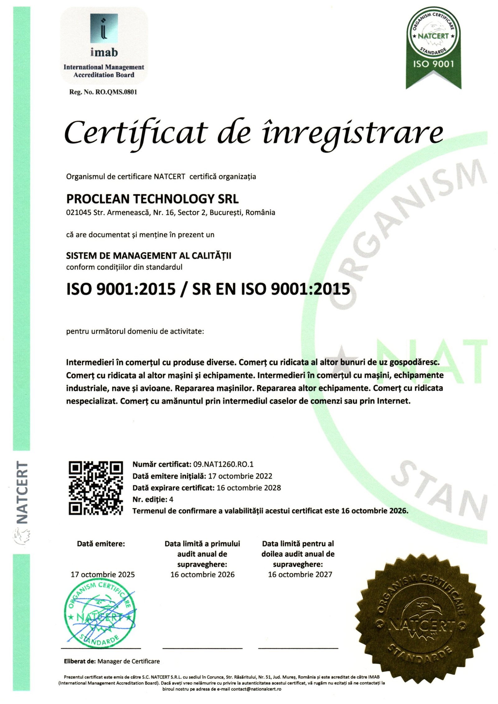 Prin obținearea certificării ISO 9001 dorim sa demonstram că activitățile societatii noastre respectă cerințele impuse de standard, astfel încât clientul să acorde încredere produselor și serviciilor oferite având în vedere că acestea repectă standarde internaționale de calitate.