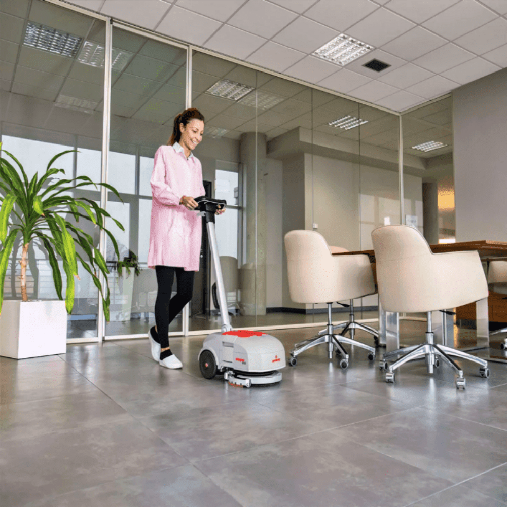 Mașina de spălat pardoseli Vispa XS este potrivită pentru activități de curățare de întreținere în spații mici și aglomerate de până la 800 m²